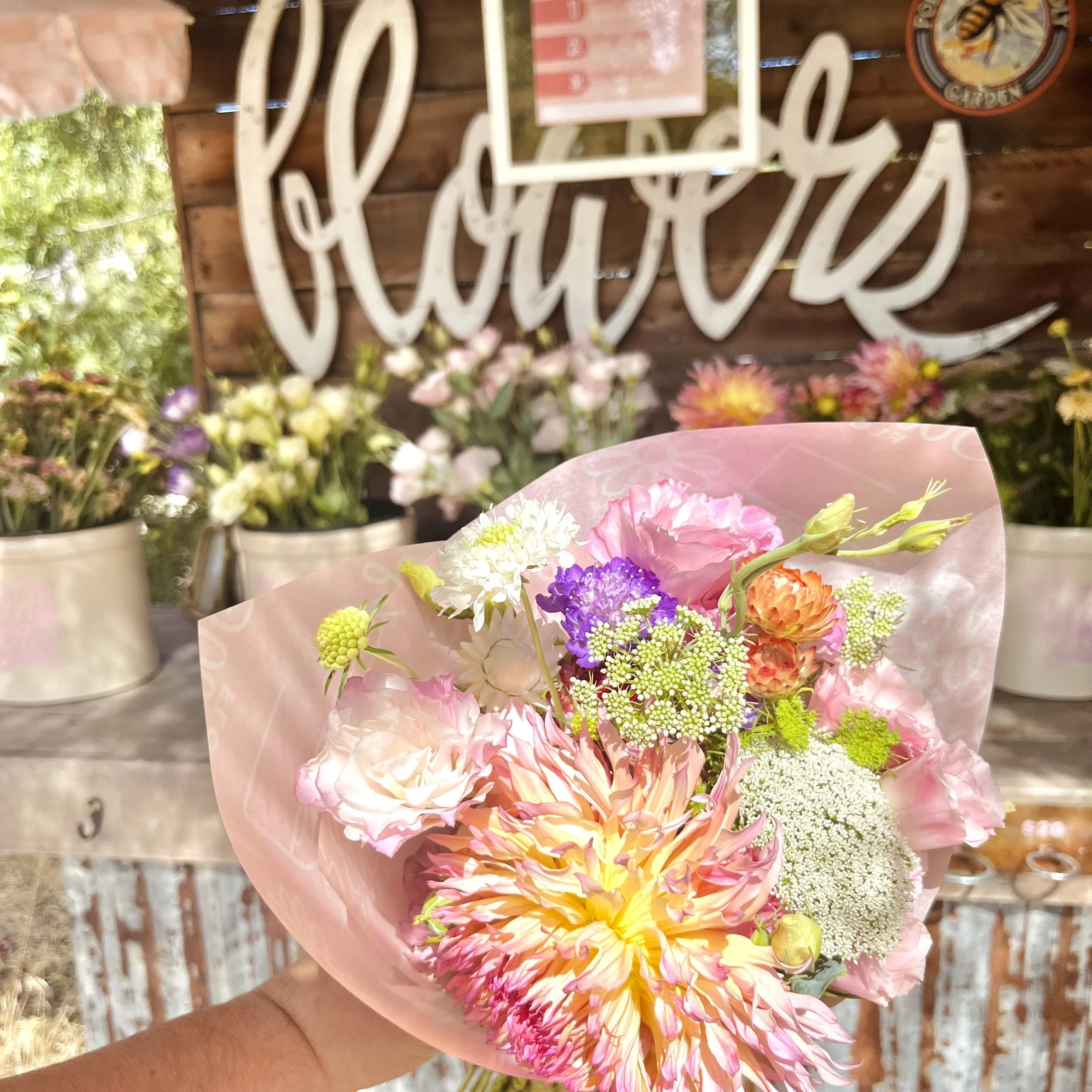 Our cart is parked on the street in front of our farm. It is loaded up daily with paper-wrapped bouquets and unique arrangements in vases.